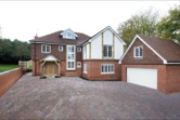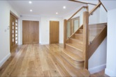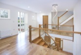 The home was fitted to a very high standard with all rooms enjoying underfloor heating, study, kitchen, dining and entrance hall enjoying high quality natural stone floor tiling, and all other rooms featuring oak flooring and skirting. Handmade Oak staircase, balcony, window features, skirts, and doors all maintained the high standard and feel. The home benefits Crestron home automation system with over 100 lighting circuits throughout, 10 zones of hi-fi quality audio inside and out, an integrated big-screen cinema in the den, and separate sound proof music studio in the detached timber framed garage block.